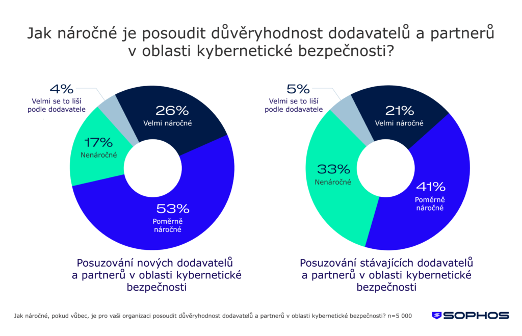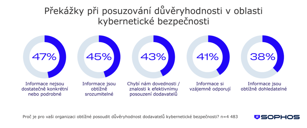 Podle průzkumu si 79 % respondentů myslí, že je obtížné vyhodnotit důvěryhodnost nových dodavatelů či partnerů v oblasti kybernetické bezpečnosti. To ukazuje na obecný problém s porovnáváním řešení, validací marketingových tvrzení a celkovým posouzením, zda potenciální poskytovatel dokáže organizaci reálně ochránit. U stávajících dodavatelů přetrvávají obdobné obtíže – více než polovina (62 %) respondentů má problém jejich důvěryhodnost průběžně vyhodnocovat. To naznačuje, že nedostatek důvěry nezmizí ani po navázání smluvního vztahu.